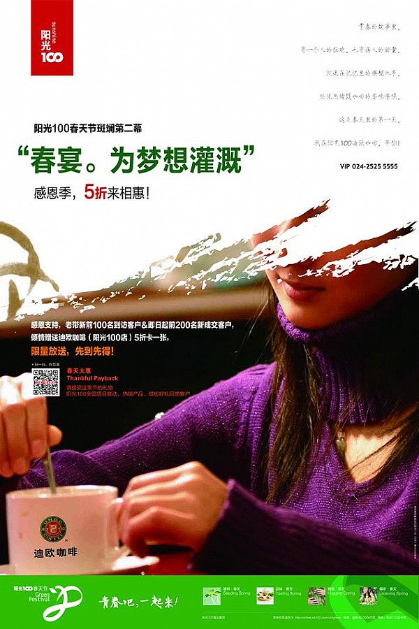 ??阳光100春天节春天大惠正式启动!为感谢老客户多年的支持以及新客户的厚爱,3月,阳光100联合迪欧咖啡推出“迪欧咖啡五折卡倾情放送”活动:3月起,前100名老带新客户与前200名新成交客户都将享赠迪欧咖啡阳光100店五折卡一张,数量有限,先到先得。详情咨询400-606-6969转62519