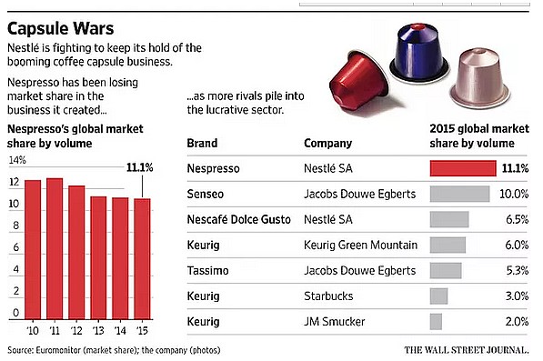 最近几年,Nespresso的市场份额不断被竞争对手所抢走。根据《华尔街日报》的报道,Nespresso在全球咖啡胶囊市场的市场份额从2011年的13%下跌到2015年的11.1%。而市场调研公司Euromonitor的数据显示,在法国市场――Nespresso最大市场,Nespresso所占市场份额从2007年的一半左右降至2016年的三分之一。