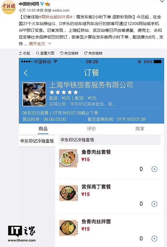 IT之家7月17日消息 根据此前中国铁路总公司发布的消息,铁路部门在各省会及计划单列市所在地的27个主要高铁客运站推出动车组列车互联网订餐服务,今天上午,12306官网订餐系统迎来更新,坐高铁终于能用手机或者12306官网订餐了。