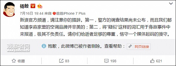 著名篮球评论员@杨毅 也微博上称警方调查结果还没出来,呼吁给逝者足够的尊重,恪守一个媒体起码的操守。