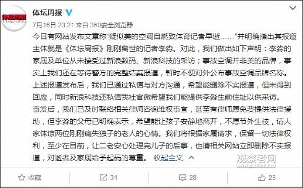 16日晚间,逝者所在单位官方微博@体坛周报 也发布声明,表示李淼的家属及单位从未接受过新浪数码、新浪科技的采访,同时事故空调并非美的品牌,还在等待警方的完整结案报道,暂时不便对外公布事故空调品牌名称。
