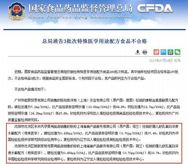 沈阳市沈河区米米氏孕婴用品店、沈阳市沈河区新新家妮母婴用品店销售的,标称由上海雀巢产品服务有限公司(原产国:荷兰)经销的“蔼儿舒”乳蛋白深度水解配方(特殊医学),硒检出值分别比产品包装标签明示值(0.7微克/100千焦)低37.4%、33.7%。