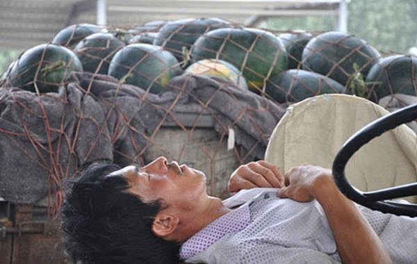 瓜农们面对冷清的市场,迷茫中带着无奈。一位瓜农在瓜车上睡觉。对于大多数瓜农而言,这一季西瓜的收入,就是一家人维持生计的希望和依靠。到中午了,也不舍得去买饭吃。