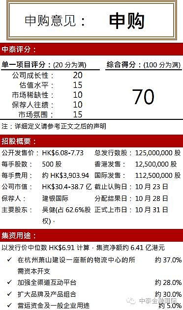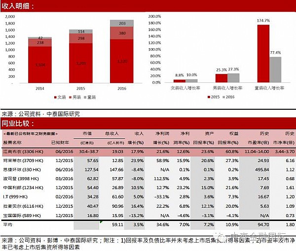设计师品牌时装产品一般具有强烈的设计师特色及标志性风格,具有较高的辨识度。根据 CIC 的资料,中国的设计师品牌时装行业是于服装行业中增长迅速的细分市场,主要是由于消费者对时装的品味越来越成熟及在服装方面日渐追求更大的个性及独特性。行业的零售额在 2011 至2015年间以26.2%的复合年增长率增长,并预期 2016-2020 年将以 26.7% 的复合年增长率增长。设计师品牌时装行业在 2015 年占整体服装行业约 2.2%,预期到 2020 年市场份额将进一步增至 3.9%。根据 CIC 调查,公司的 JNBY 品牌被认为中国最独特及获认可的女装设计师品牌,按品牌认知度计排名第一,按复购数目计于中国十大女装设计师品牌中具有最高的品牌忠诚度。营运方面,公司实行「与客户共同成长」的业务策略,透过广泛的产品及品牌组合创建了一种可以满足客户在不同生活阶段所需要的生活方式的生态圈,打造了众多及忠实的客户群,该群忠诚客户可为其孩子、配偶或其他各个年龄段的家庭成员购买不同品牌时装。我们相信随着 80/90 后消费者个性化消费趋势越来越明显,设计师品牌未来发展空间巨大,公司作为设计师品牌时装行业的领军者公司,其简约概念及简洁线条的设计相信可受惠个性化消费的趋势。估值方面,若以招股价范围中值及 2016 财年经调整利润(扣除上市及股权补偿开支)计算,历史市盈率约11.3倍,我们认为相对公司未来增长速度,公司现时具投资价值。公司财政状况良好,净现金比率约 58.2%,近 3 年自由现金流约 5.2 亿元人民币。综上,我们给予其 70 分,评级为「申购」。