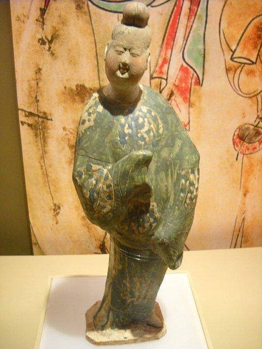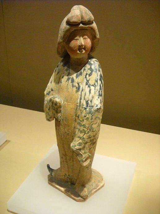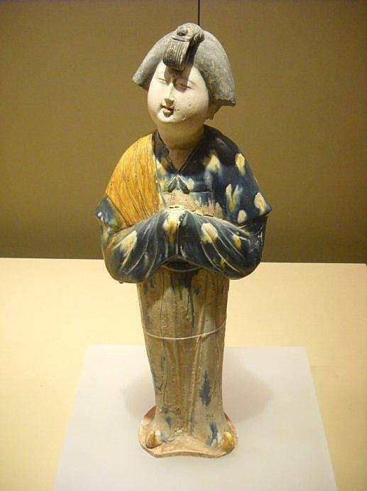 博文中展示的是唐代时期的“彩绘三彩釉女子陶俑”。唐朝妇女爱美,特别注重发式新奇与面部修饰。这一时期妇女的发式主要有半翻髻、双环望仙髻、囚髻、抛家髻、惊鹄髻、螺髻、百合髻、圆鬟髻等。发式之上插饰各种珠翠花钗、步摇、梳子之类。为追求新奇之美,唐代妇女常创造出新的发式,有的高出面部两倍以上,杨贵妃为标新立异,竟以假髻为饰。