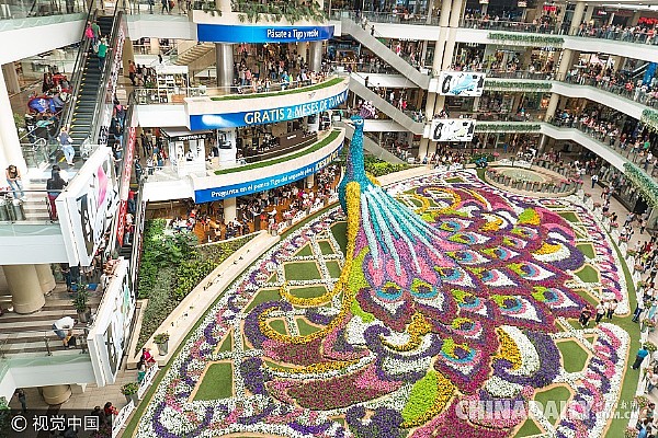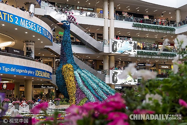 哥伦比亚庆祝“鲜花节” 商场展出12米高由182万朵花打造的三维孔雀