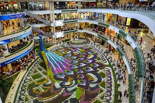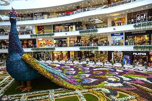 在这家购物中心大厅内,竖立着一只三层楼高的“花孔雀”。孔雀躯干由深蓝色的花朵拼成,翅膀则由五颜六色的花组成。这只孔雀并未开屏,但远远望去,羽翼如同一袭华衣,五彩斑斓,美丽动人,吸引不少客人驻足观看。