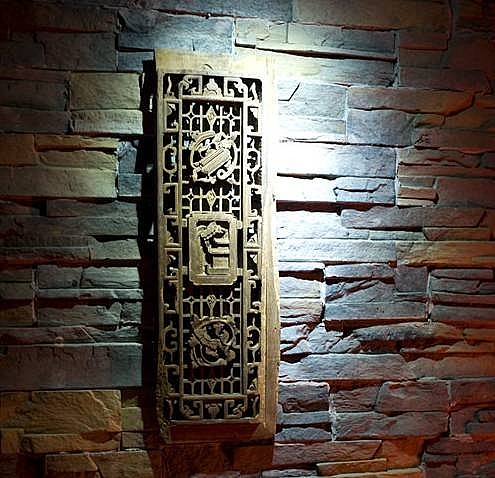各种字画,根雕,摆件还有一处假山景观,街面上这家雕龙画凤的门脸和旁边一个播放着维秘的大屏幕形成了中西文化的冲撞。