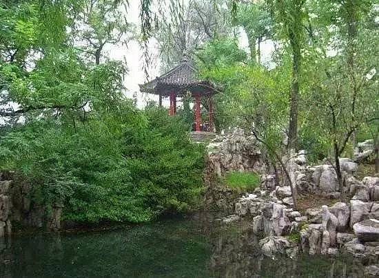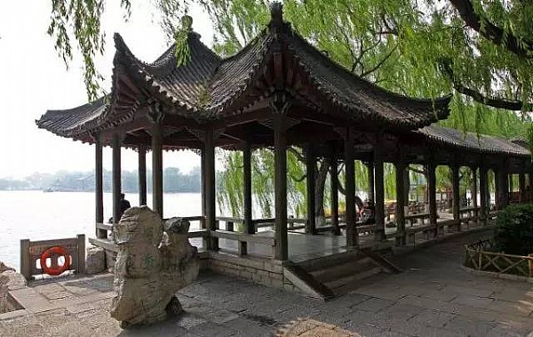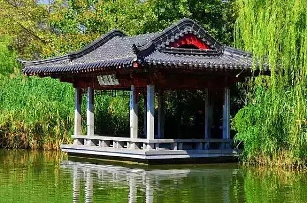 与谁同坐轩北连长廊,长廊的尽头有两个方亭,其一角互相联结,寓意相依相偎、永不分离,称为“鸳鸯亭”。全国各地,为了迎合人们的情感,这样命名的亭子不少,济南亦不能超尘拔俗。石柱、木梁、灰瓦,亭旁立石刻写“鸳鸯亭”三个大字,引得情侣在此驻足、拍照。