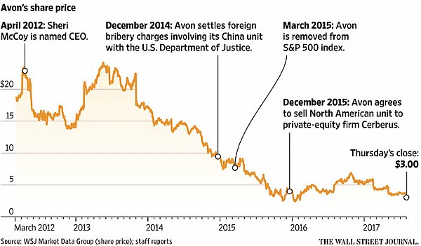 2012年全球日化巨头科蒂曾向经营处于困难期的雅芳抛出收购的橄榄枝,但雅芳董事会拒绝了这107亿美元的诱惑,坚持认为CEO Sheri McCoy可以扭转颓势。然而在随后的五年中,雅芳的股价下跌了85%,最近三个季度的业绩增长均为负数。