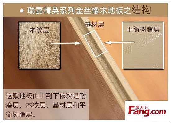 地板的结构决定了它的质量,这款地板由上到下依次是耐磨层、木纹层、基材层和平衡树脂层。耐磨层即三氧化二铝层也称刚玉,它决定了地板的耐磨程度是地板寿命的保证,精英系列地板耐磨层为46g/?,达到公共场所用的地板的规格。木纹层就是上面提到的木纹纸。基材层是关键所在,这款地板选用天然小口径树木,经过粉碎压缩处理而成,吸水膨胀率小。平衡树脂层即地板的背面,起到防潮稳固的作用。