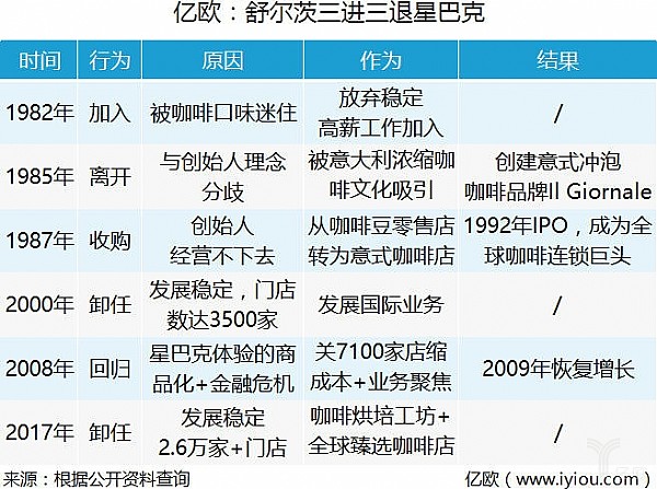 1985年,舒尔茨由于跟星巴克创始人产生理念分歧,离开星巴克后,偶然的机会,被意大利的浓缩咖啡吸引,创建了Il Giornale-意式冲泡咖啡店。在星巴克创始人经营不下去的时候,又重新回头把它买下来,转型为如今的星巴克。