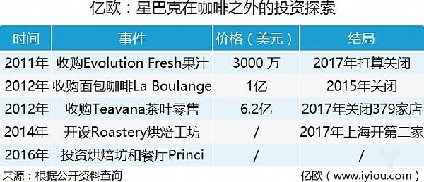 此外,早在几年前,为了笼络更多顾客,并寻找新的利润增长点,星巴克就已经以投资和收购探索开启多品牌战略,曾于2011、2012年件收购果汁、面包咖啡、茶饮等品牌,但结果被证实都以失败告终。