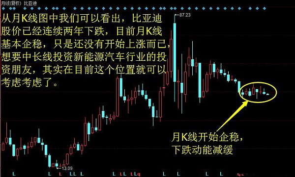 从月K线图中我们可以看出,比亚迪股价已经连续两年下跌,目前月K线基本企稳,只是还没有开始上涨而已,想要中长线投资新能源汽车行业的投资朋友,其实在目前这个位置就可以考虑考虑了。