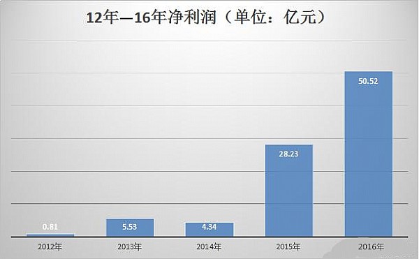 从下面两组数据中我们可以发现,从2012年到2016年,比亚迪公司营业收入不断增长,2012年营业收入为468.5亿元,2016年营业收入为1034.7亿元,复合增长率为21%,而净利润增速比营业收入还要快,2012年净利润为0.81亿元,2016年净利润达到50.52亿元,4年净利润复合增长率达到了惊人的180%,如果拿2013年与2016年的数据进行对比的话,3年净利润的复合增长率也达到了惊人的101%。