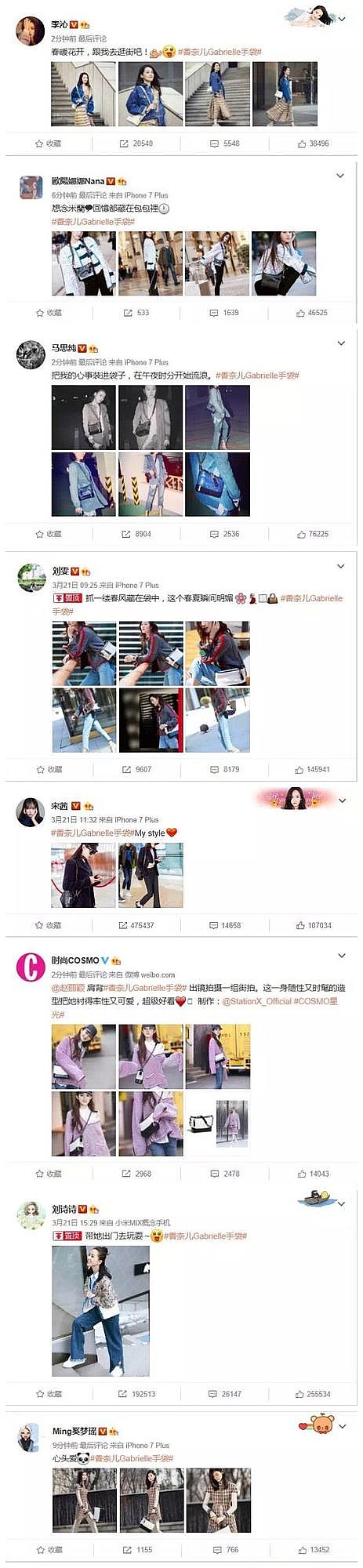 包括刘雯,杨幂,迪丽热巴,周冬雨,周迅,刘诗诗,白百合,赵丽颖,马思纯等各大当红女星都纷纷秀起了同一款手袋!