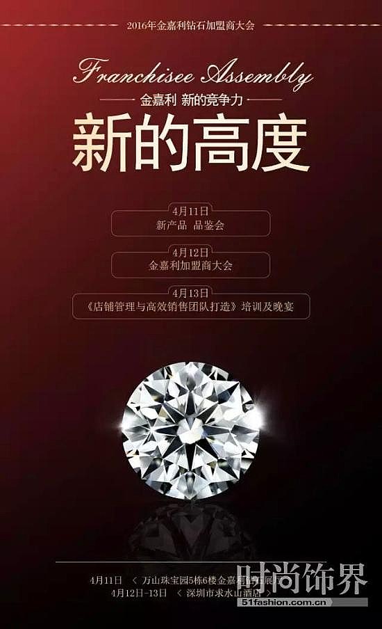 2016年金嘉利钻石加盟商大会将于2016年4月11日-2016年4月13日在深圳盛大召开。