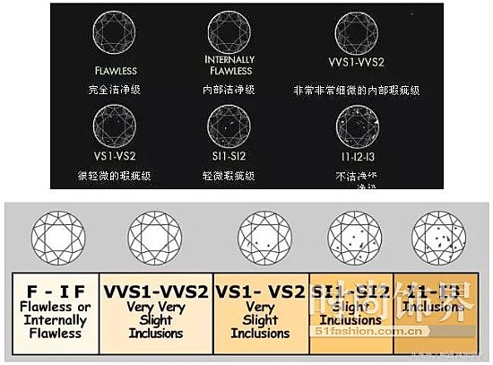 天然钻石内部或多或少会含有一些包裹体、杂质、裂隙等,这些都是影响钻石净度的主要原因。钻石净度级别从高到低依次为LC(FL、IF)、VVS(VVS1、VVS2)、VS(VS1、VS2)、SI(SI1、SI2)、I(I1、I2、I3)等,共5大级11小级。钻石净度级别以10倍放大镜观察为准,但日常佩戴中肉眼下看到不净度特征就可接受,因此建议选择VS级以上就可以,虽有杂质但肉眼不可见,如此级别性价比更高。