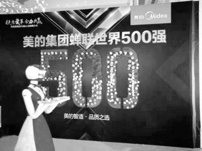 在活动大厅,到场的经销商和嘉宾将机器人送来的鲜花放在签名墙上,共同拼成“500强”字样。今年美的集团营收跨过2000亿元,连续两年登上世界500强,以市值2700亿元稳居中国家电行业首位。