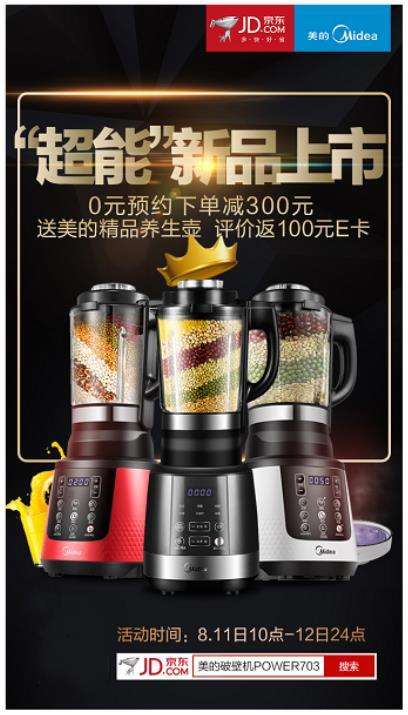 2017年8月1日,美的生活电器与京东家电在京东总部联合举行“科技美的,品质京东”秋季新品发布会。发布会上,美的生活电器一举发布三款“超能”系列破壁机Power701、702、703,意欲联合京东挺进国产破壁机高端市场,为中国消费者带来更完美的料理体验。