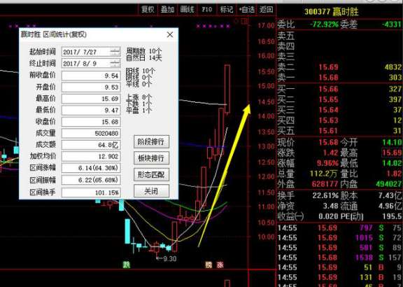 3.今日底部个股出现不少涨停个股,图形较为相似,横盘挖坑横盘,启动,尤其是今天创业板进本保持全天红盘震荡,赢时胜更是从底部10连阳,10个交易日上涨63%,今日尾盘差点二连板。