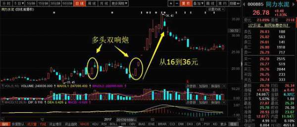 同力水泥是1月份做的一只实盘票,主力深度介入股并且底部较长时间的强势震仓洗盘,多头双响炮就是启动信号,在低位果断杀入,虽然没有从19拿到36,但是收益也颇丰,我们回顾一下同力水泥这个多头双响炮股的技术走势: