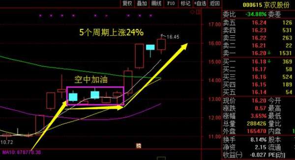 京汉股份000615这只股票我的粉丝们都不陌生了,当时股价经过两个涨停的拉升之后开始高位横盘调整,主力资金持续流入,形成空中加油的形态。8.10日出现单针探底,当天在朋友圈上选出并重点讲解,讲过之后5个周期上涨24%,就是这么的简单。当时看了朋友圈并且相信了本人入手的朋友轻轻松松拿下了这波利润。