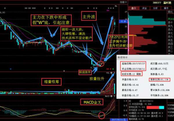 说到此股,本人也着实佩服主力的动作,那么大家看上图也异常明显,主力在前期的一波中形成了假”W“底,很多朋友也都知道W底之后会有一波大的拉升,但是随后的一波下跌中,引起了技术派和不坚定的散户朋友恐惧,随机抛出筹码,主力乘机大肆吸筹。那么探底之后,股价开始走稳,MACD金叉开始上行,本人也是及时在7月27日在朋友圈中用三步擒牛法及时讲解该股,那么大家也可以看到,自讲解之后,12个周期的时间,涨幅高达61.11%!这样的战法牛不牛呢?我相信是非常牛的。
