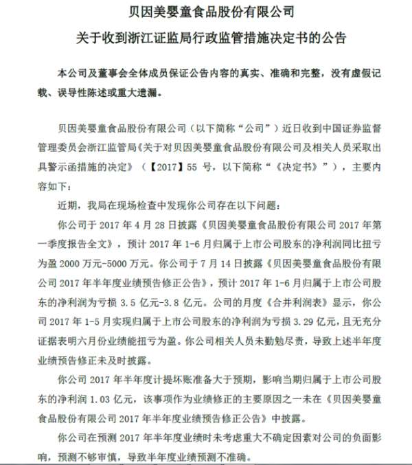 【业绩预告大变脸,贝因美及四名高管遭浙江证监局警示】贝因美8月16日晚间公告称,公司收到浙江证监局行政监管措施决定书,浙江监管局指出公司相关行为违反《上市公司信息披露管理办法》相关规定,决定对公司及责任人董事长王振泰、总经理黄焘、董秘鲍晨、时任财务总监沈立军予以警示。决定书显示,公司在预测2017年半年度业绩时未考虑重大不确定因素对公司的负面影响,预测不够审慎,导致半年度业绩预测不准确。