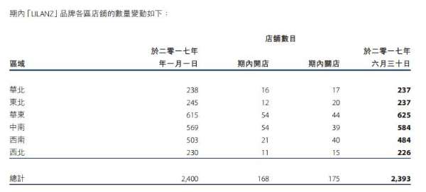 公告显示,截止2017年6月30日,“LILANZ”品牌的店铺数量共2,393家,期内净减少7家,主要是因应实际经营状况调整店铺网络提升效益,以及百货商场店中店数目减少所致。