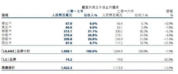 根据公告显示,华东与中南地区仍然是LILANZ品牌的收入贡献最大区域,合共占LILANZ总收入57.9%(2016年上半年:55.7%),店?数量占比50.5%(2016年上半年:50.0%)。除此之外,其他地区除了华北地区录得轻微增长外,各区的销售都有所减少。西北地区销售倒退较多,达25.3%,主要由于陕西和新疆受2016年春夏季的渠道库存问题影响较深。但此乃短暂的影响,而西北地区的销售亦已于2017年秋季回复升轨。西南地区亦录得双位数的销售下跌,主要受重庆地区销售下跌影响。华北地区录得增长,主要是内蒙古于去年上半年更换了分销商后销售大幅增长,抵销了山西销售的下跌。