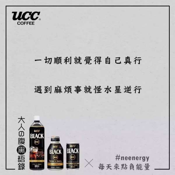 除了做咖啡、卖咖啡,UCC 也做了很多有趣的活动,例如和动漫联名,或者为旗下黑咖啡策划「负能量」征集活动。