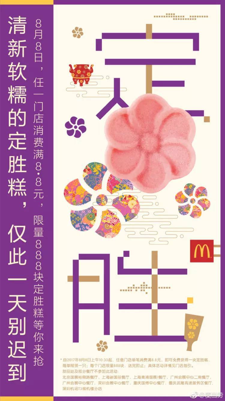 有趣的是,在庆祝新公司成立当天,麦当劳中国第一次推出了中式糕点——定胜糕,只要顾客消费满 8.8 元即可免费获得一枚粉色糕点。选择这个时间点,看起来颇具象征意义。