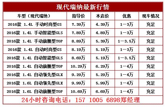 进入盛夏以来,与持续高温的天气形成鲜明对比的是车市人气和销量的逐渐转淡。面对这一情况,众多厂家和经销商都纷纷推出优惠促销活动,期望提高人气和提升销量。由于7月刚过去,车市相关数据还未出炉,我们就拿7月来说,6月乘用车的销售情况要总体好于6月,7月销量环比和同比均呈小幅增长,汽车销量榜又免不了一场腥风血雨的争夺赛。当然,销量仅仅是作为很多用户买车参考标准的其中之一,最关键的还是得看价格。近期现代瑞纳,全国30多个城市限时优惠。尤其北京汽车销售公司综合店内瑞纳限时低价促销 现车让利直降4万.欢迎到店咨询.24小时咨询电话:15710056898郑经理