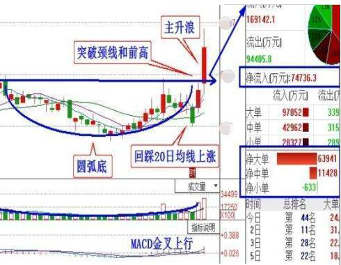 该股股价在横盘区形成圆弧底看涨形态,先缩量证明大量散户割肉离场,之后持续温和放量证明有主力在持续吸筹。然后放量突破圆弧底颈线和前高,形成多头趋势,上涨空间打开,macd和kdj金叉,证明快速上涨阶段已经到来。其实像这种短期能大涨的潜力股我一直在讲解,近期可低位布局的三只利好个股已经用一分钟选股法在朋友圈,股市找我中发布。