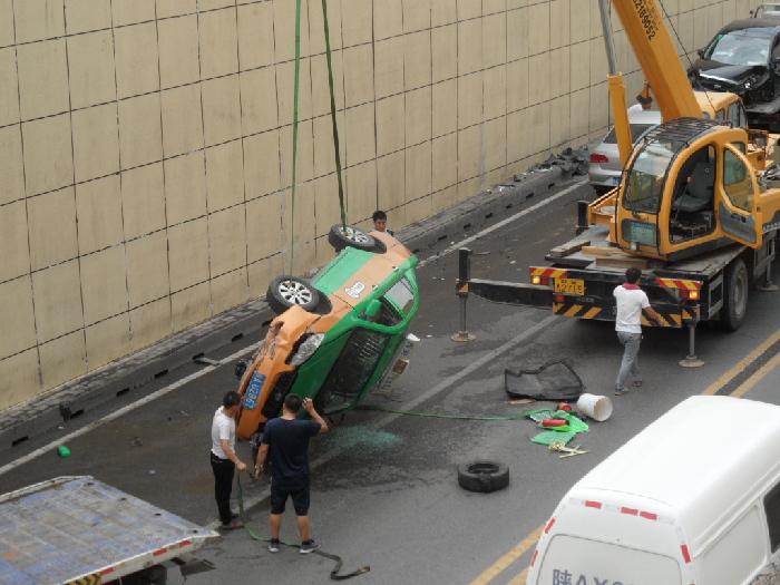 今天上午8点30分,市民何女士在途经玉祥门地下隧道时,目睹了一起四车相撞的交通事故:一辆黑色轿车在隧道里由北向南行驶,突然与前车发生追尾事故。接着这辆黑色轿车似乎失控撞向迎面而来的一辆出租车,随后出租车又撞向另一辆私家车并侧翻在地,一名老年乘客被困出租车内。“看见有人被困,有车主停车救人,但是老人被困无法动弹,最终消防战士赶来,才将老人救出,送往医院。”何女士说。