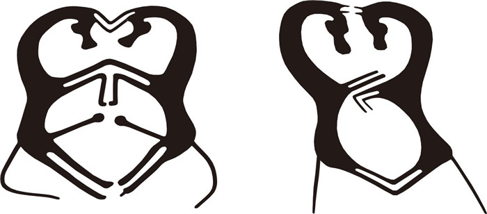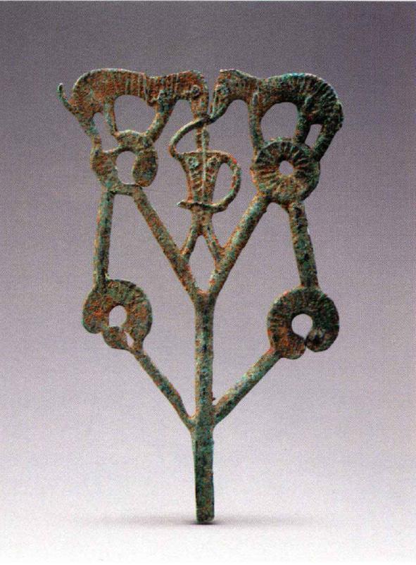 再看岩画上非常凸显的对马图也别具深意,只见两个对马都是头脚相对。而在四川省凉山彝族自治州盐源县发现的青铜枝形器的顶部也是一对头部相对的双兽,其身体上的折线三角形平行纹饰与康家石门子岩画中大型动物的身体纹饰十分相似。