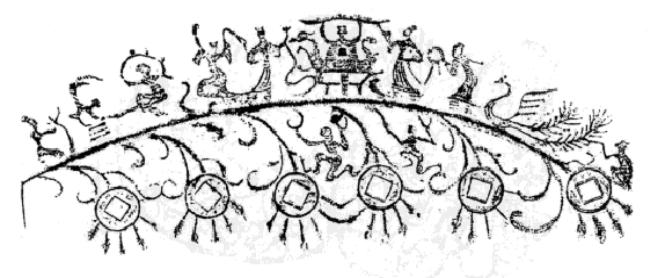 与枝形器形态类似的,又同样发现于西南地区的汉代的摇钱树跟它总体形态比较接近,而这些摇钱树有非常明确的西王母形象。青铜摇钱树树枝(整树亦如此)与盐源青铜枝形器存在许多一致性特点:1、都是树形器; 2、无论树形还是树枝对称布局; 3、主要人物(女神)居中;4、存在与主要人物对应的对兽形象;5、日轮变换为类似铜钱的图案,但是圆形铜钱边缘残留有表现太阳的光芒线条;6、同为古人思想、精神层面的具象呈现。
