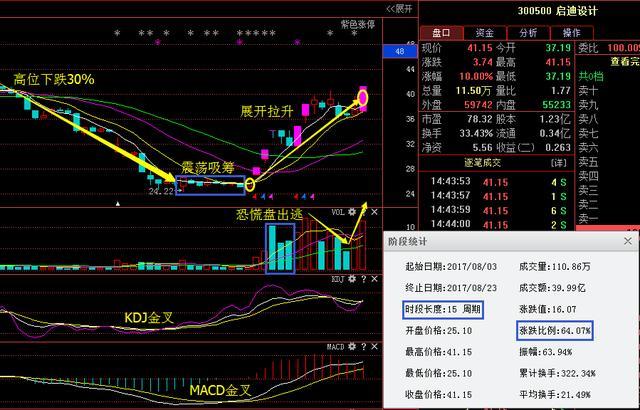 我们首先来看第一只300500启迪设计,大家可以看到该股从高位下跌30%,在底部形成KDJ金叉,随后经历了一波小幅的震荡吸筹之后MACD随之形成金叉买入信号,本人在8月3号当天看到之后果断给大家专栏发文讲解,讲解完之后展开拉升,其中放绿柱拉升证明恐慌盘出逃,后市可观,自本人讲解完之后截止到目前涨幅64.07%。当然这只是本人专栏粉丝的朋友所能抓住的利润空间,希望下一期的各位不要再错过,毕竟想想都可惜抓住这样的短线股也不是那么容易。