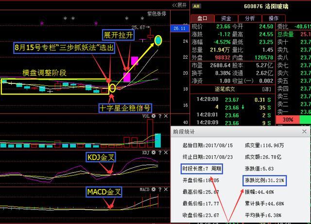 接下来我们来看600876洛阳玻璃,该股是本人在8月15号专栏同样根据“三步抓妖战法”选出发文讲解的,大家可以看到该股前期一直处于横盘整理阶段,随后在8月15号当天形成十字星企稳信号,且MACD和KDJ也形成金叉买入信号,本人看到之后也是第一时间给大家讲解,讲解完后展开拉升,截止到今天收盘涨幅31个点之余!