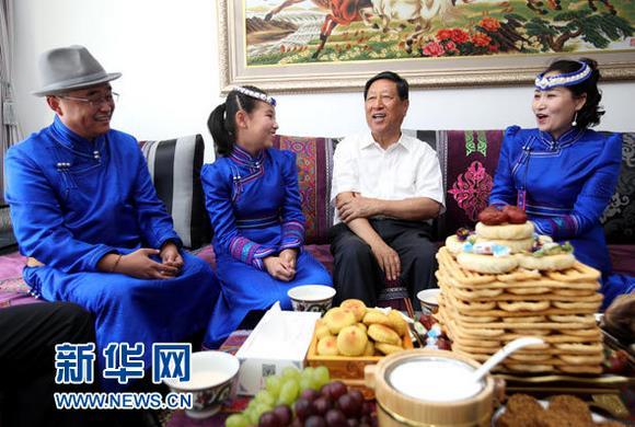 这是张平在蒙古族居民哈斯戈日乐(右一)家详细询问全家工作和生活情况。新华社记者 邓华 摄