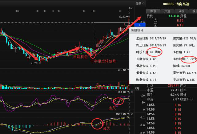 海南高速000886也是本人用三步擒牛战法选取并在7.19日发文讲解的,大家可看到此股的走势从前方的高点回落至低点4.26之后主力资金拐头向上,震荡上行,随后回踩走出了十字星反转信号,我就发现此股的建仓良机,回踩就是机会并且他下方的KDJ,MACD指标呈现了金叉买入的信号,主力资金在加速进场截止目前短短的26个周期的时间也是收获了31.97%的涨幅。在这里也是恭喜下一直关注我并成功布局的粉丝朋友,抓住的粉丝朋友也不要太兴奋了,后期的操作策略及走势我会继续在朋友圈中发文讲解,大家注意及时的查阅。