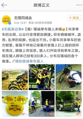 与此同时,ofo小黄车无锡、兰州、保定等多地的用户还自发组建ofo城市猎人团队,对各种不文明用车行为进行监督和处理。在ofo小黄车的官方群里,客服不停地记录着城市猎人们上报的车辆损坏情况,降低运维成本及难度,在一定程度上保障了用户的顺利出行。