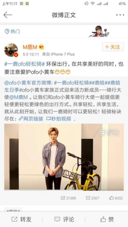 肩负企业责任,杜绝行业乱象,是ofo小黄车一直以来不懈的追求。前不久,签约鹿晗成为骑行大使正是看中了其超强的粉丝效应,在官方App中上线鹿晗语音包,呼吁用户文明、规范、安全用车。此举受到了“芦苇”们的一致好评,并纷纷表示响应爱豆的号召。