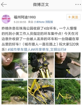 “路见不平,拔刀相助”是ofo城市猎人们的行事准则,网友@福州阿迪1993表示:“昨晚休息在珠海公园收获了4台坏车,一个人慢慢的托到小黄工作人员指定的坏车集中点!今天在河边意外收获了一台被人丢弃的坏车和一台隐藏在草丛里的好车!(城市猎人一直在路上)祝大家520快乐!”520都不忘“外出打猎”,真是尽职尽责。