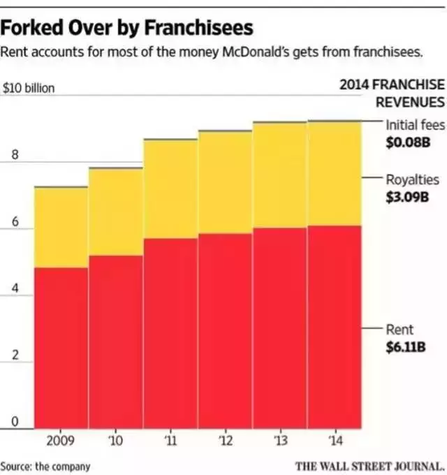 如果将这些年麦当劳从特许经营商处获得的营收拆解来看,就能发现这家公司在业绩下滑时,还能基本稳定维持赚钱的秘诀:门店销售额的分成、以及新加盟商缴纳的初始加盟费所占的比例都不高,最多的反而是房租收入。