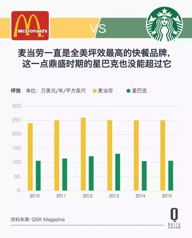 麦当劳比星巴克的坪效高,但每个星巴克员工为公司创造的收益比麦当劳要高如果没有足够多的门店作为支撑,客单价相对较低的星巴克,还是无法达到麦当劳那样的单店盈利水准。事实上,在行业机构 QSR 的年度榜单中,麦当劳几乎一直是全美坪效(单位面积物业所带来的销售额)最高的餐饮品牌,仅在 2010 年被炸鸡品牌 Chick-fil-A 短暂超越。