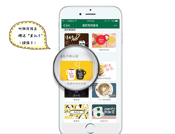 星巴克整个流程大概一出来,你一进去所谓的星巴克中国微信公众帐号下面有“用星说”,点进去以后发现上面有两格是单杯咖啡,后面有八行你可以买礼品卡,50、80、100\u00A0元。