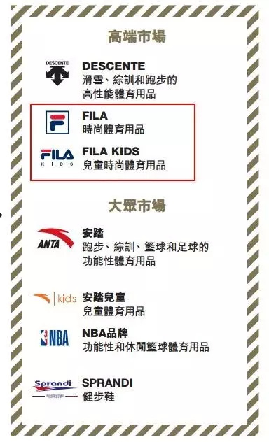 目前,安踏自称是“一家聚焦運動用品的多品牌公司”,而FILA系列则是其区别于已有安踏自身定位于大众市场之外的高端市场。