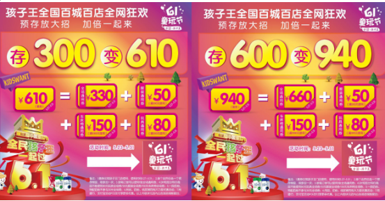 5月23日开始,孩子王会员可登陆官方App参加六一预存活动,存300可得610元门店套券;存600可得940元门店套券,所得优惠套券可于5月27日-5月31日于孩子王全国门店使用。同时,本届孩子王童玩节预存活动期间(5.27-5.31),全场奶粉、纸尿裤、零辅食等将推出满额立减活动,会员购以上品类实付900立得100元券。另外,童装、玩具、童车童床、儿童安全汽座等品类同期优惠放“大招”,童装4.5折起,玩具8折起,车床椅除了可享满额立减优惠外,团购商品低至5折起,会员持建设银行信用卡或支付宝购物还可享受额外购物优惠。